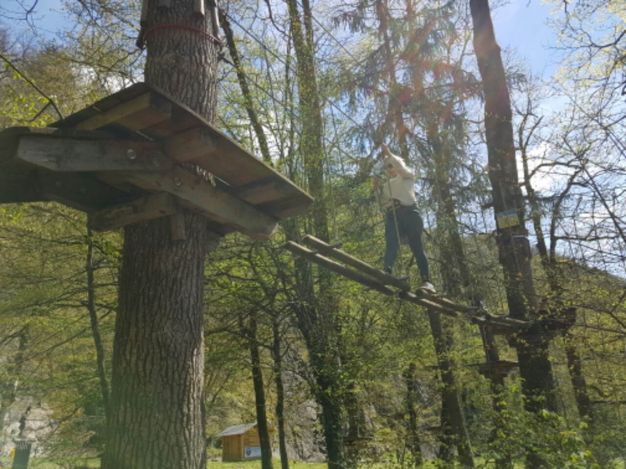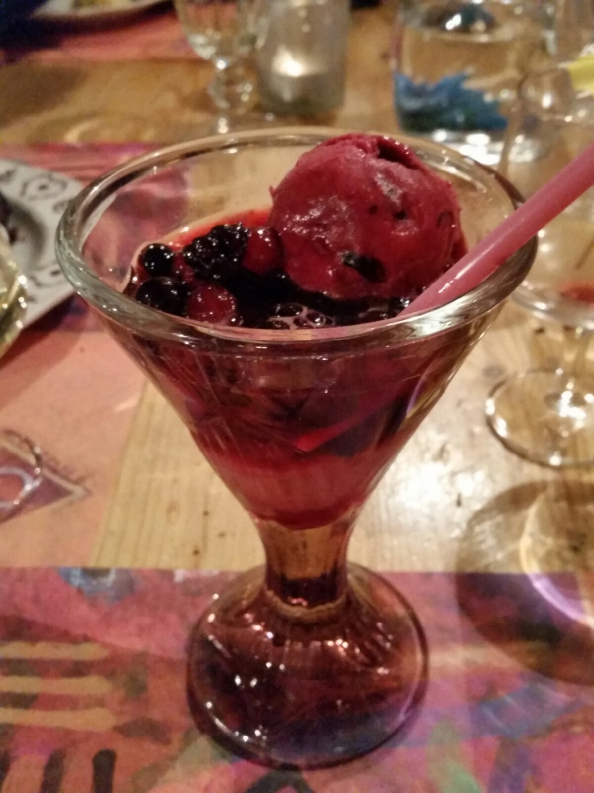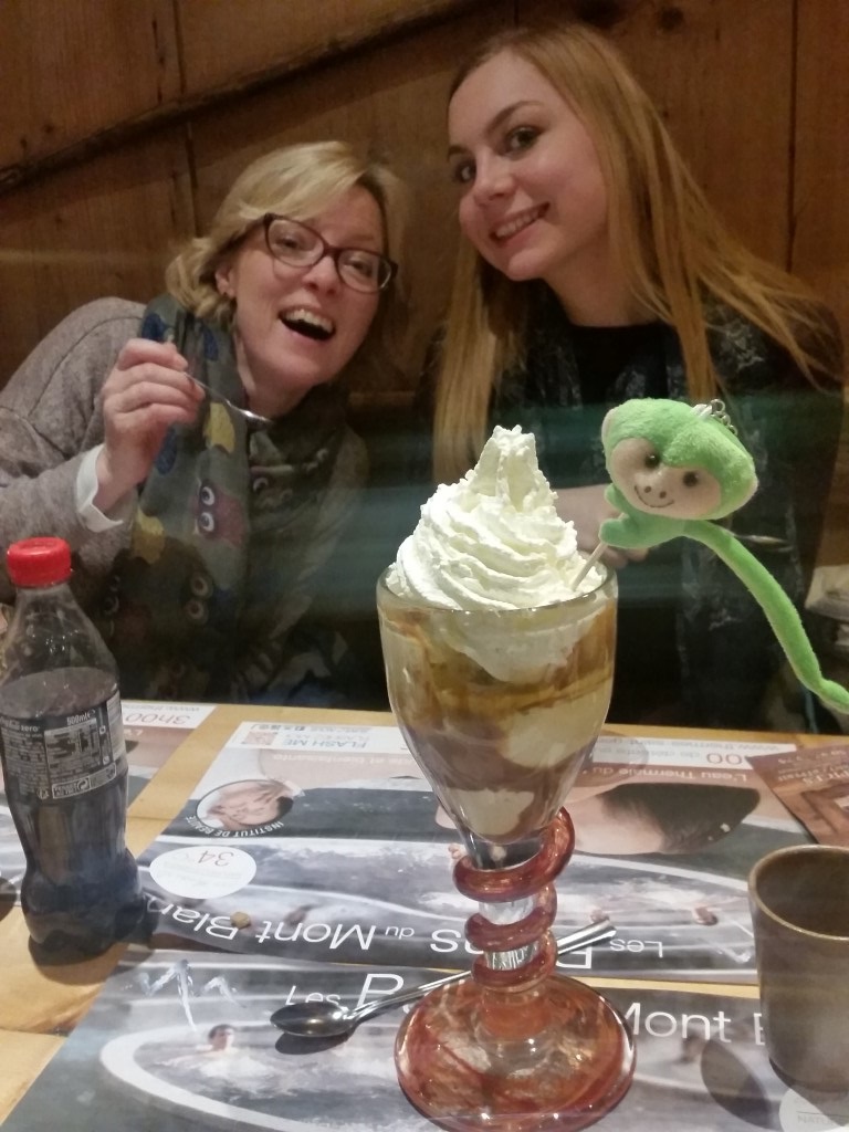 Saturday evening we went out for our first local restaurant meal down in St Gervais, It was a Savoyard restaurant which served my favourite dish Tartiflette :) This I followed up with Tatin Glace, complete with monkey keyring decoration. |